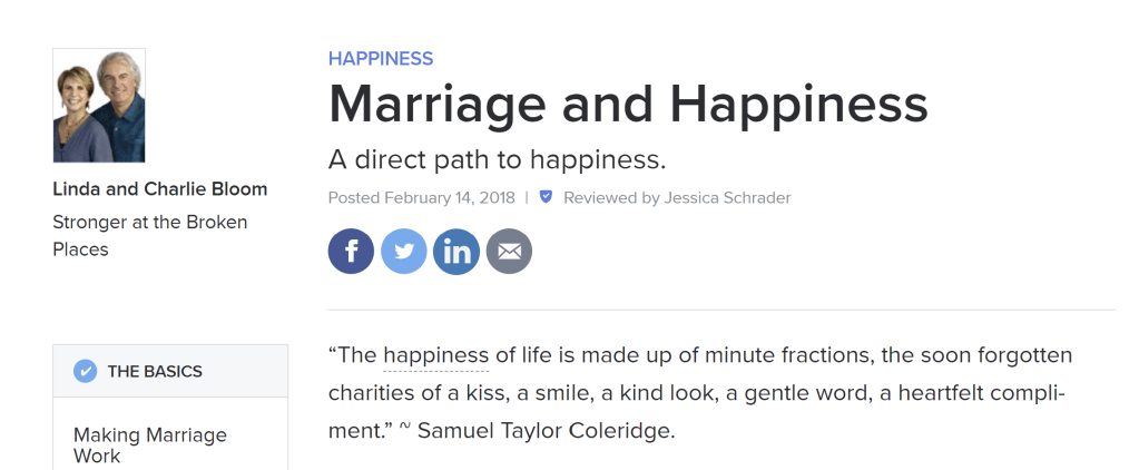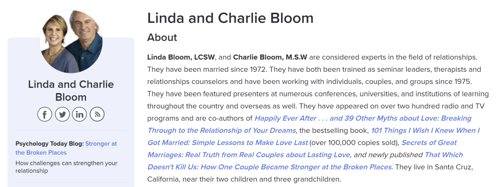 The first blog is by Linda and Charlie Bloom, two authors of books on relationships who have been married since 1972.