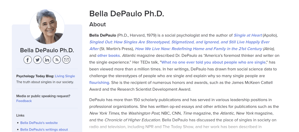 The opposite conclusion is presented as a scientific fact in blog posts by Bella DePaulo, who is proud to have been single her whole life and has written many books on being happy as a single.